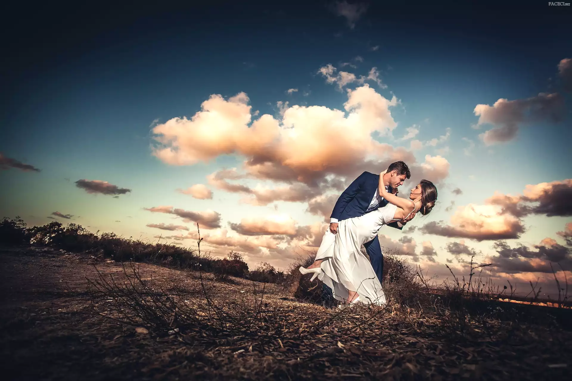 Suknia, Chmury, Kobieta, Mężczyzna